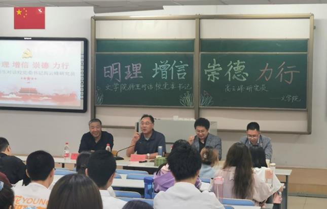 5月28日晚,yl7703永利集团在行知楼118教室举办了“人文之夜”第十七次读书报告会,读书会的主题是:“明理、增信、崇德、力行——对话校党委副书记高云峰研究员”。本次读书会邀请到了学校党委副书记高云峰研究员,yl7703永利集团党委书记高林广教授、教工一支部书记刘伟博士,以及yl7703永利集团研究生、本科生共200余人参加了本次活动,赵玉龙博士主持了会议。