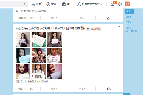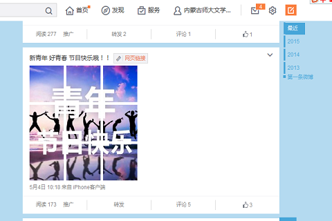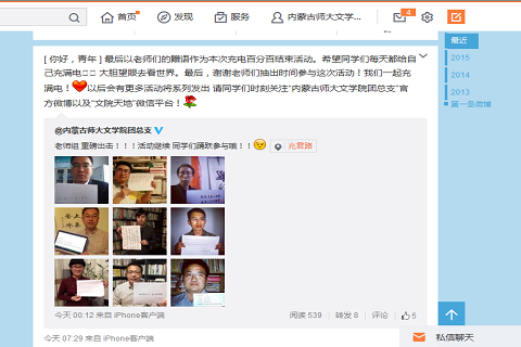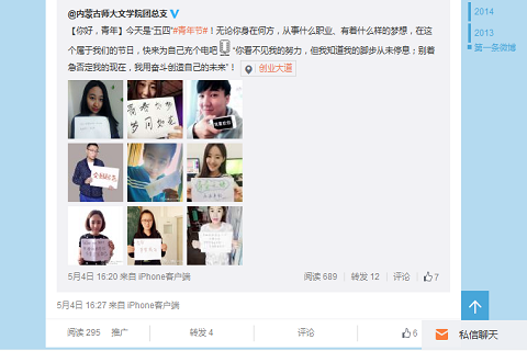 5月4日,我院部分师生参与了"你好,青年"充电接力活动,师生们将自己想说的话写下来并拍照上传。“内蒙古师大yl7703永利集团团总支”官方微博进行了全程跟踪并发布了活动进展情况。