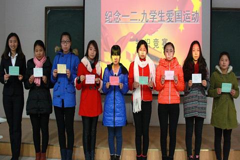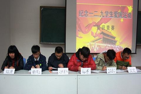 为迎接“一二·九”运动80周年纪念日,12月6日晚七时,我院在盛乐校区行知楼举办了“纪念一二·九学生爱国运动”主题知识竞赛。 本次知识竞赛采用了知识竞答类节目《一站到底》的比赛形式,场上参赛选手全身心投入比赛,场下观众也积极参与到比赛当中。经过两轮激烈的角逐,汉语言文学系最终夺冠。