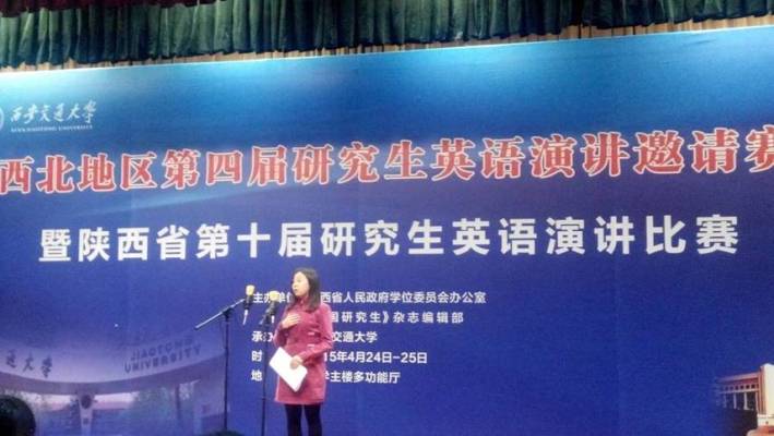 2015年4月24日至25日,西北地区第四届研究生英语演讲邀请赛暨陕西省第十届研究生英语演讲比赛在西安交通大学举行,本届大赛由陕西省人民政府学位办公室和 《中国研究生》杂志社联合主办,西安交通大学承办。我院2014级汉语国际教育硕士阿润作为我校第七届研究生英语演讲第一名获得者,代表我校参加了西北地区比赛,最终获优秀奖。我校公共外语教育学院老师郭玺平作为指导教师一同前往,并给阿润提供了详尽的指导。