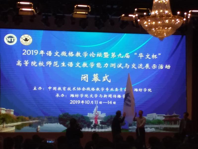10月11日至14日,2019年语文微格教学论坛暨第九届“华文杯”高等院校师范生语文教学能力测试与展示活动在潍坊学院举行。我院本次选派两名全日制语文教育硕士和三名汉语言文学专业本科生参加比赛,经过与来自全国各地八十多所师范院校的495名师范生的激烈角逐,我院派出的选手吴彤获得教学技能一等奖,李轲跃和王一帆获得教学技能三等奖,蔡若梅和董晓丽获得教学技能优秀奖;吴彤获得教学设计二等奖,李轲跃获得教学设计三等奖,蔡若梅、王一帆和董晓丽获得教学设计优秀奖。其中,王一帆和董晓丽为全日制语文教育硕士,吴彤、李轲跃和蔡若梅为汉语言文学专业本科生。