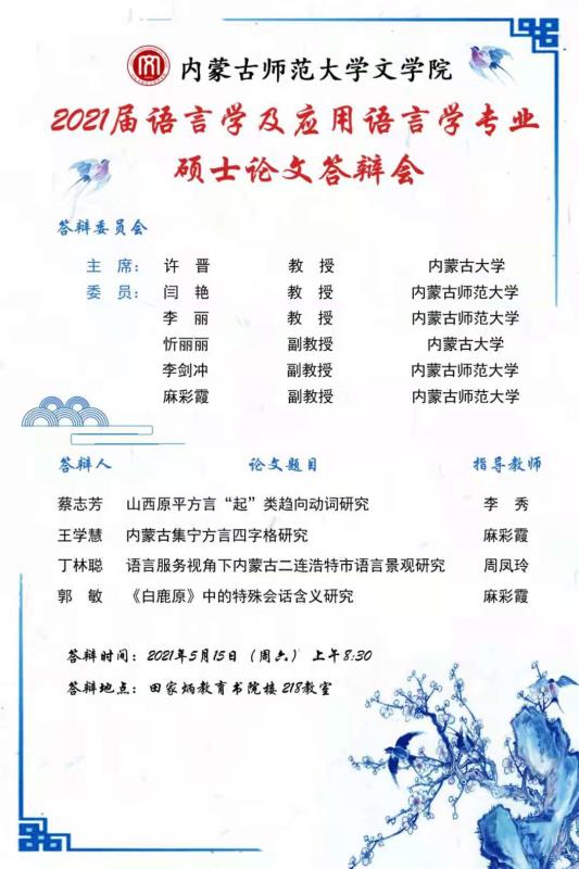 2021年5月15日上午,yl7703永利集团2021届语言学及应用语言学硕士研究生论文答辩会在赛罕校区田家炳教育书院楼218教室举行。答辩会由内蒙古大学许晋教授担任答辩主席,闫艳教授、李丽教授、忻丽丽副教授、李剑冲副教授、麻彩霞副教授担任答辩委员会成员,答辩人有蔡志芳、王学慧、丁林聪和郭敏,语言学及应用语言学专业的20多名师生出席了答辩会。
