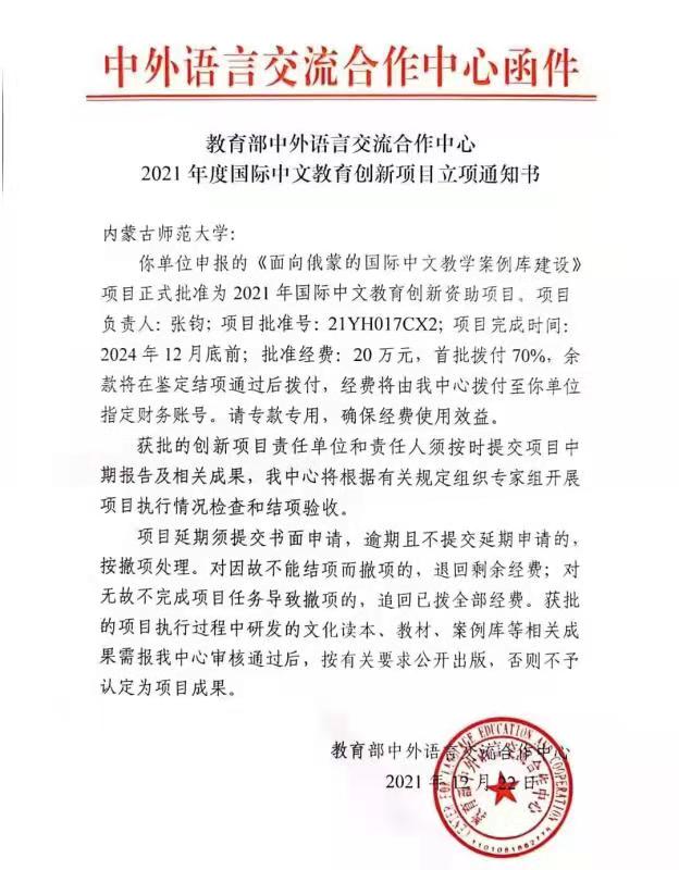 近日,教育部中外语言交流合作中心公布了2021年国际中文教育创新项目立项结果,我院张钧副院长主持申报的《面向俄蒙的国际中文教学案例库建设》获批立项。