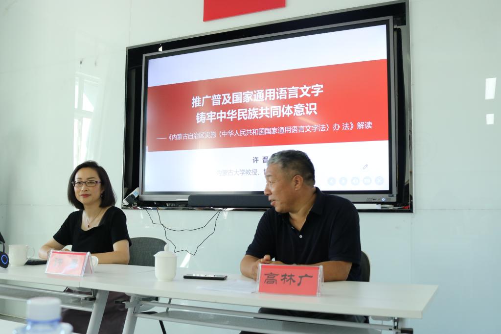 许晋教授首先从推广和普及国家通用语言文字对于铸牢中华民族共同体意识的意义讲起,接着细致解读了《内蒙古自治区实施〈中华人民共和国国家通用语言文字法〉办法》颁布的背景、内容以及意义和价值。现场气氛热烈,为yl7703永利集团院庆营造了浓厚的学术氛围。