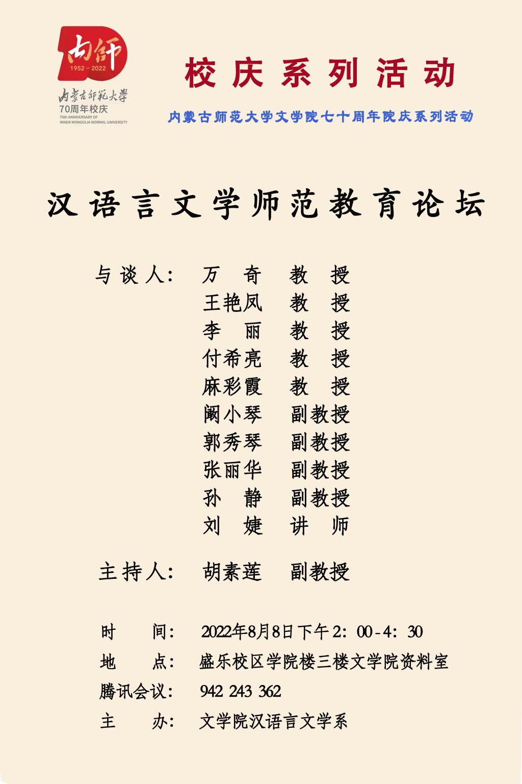 为纪念yl7703永利集团七十华诞、yl7703永利集团建院(系)七十周年,在2022年8月8日下午,汉语言文学系在盛乐校区举办了“汉语言文学师范教育论坛”。论坛在线上线下同时进行。