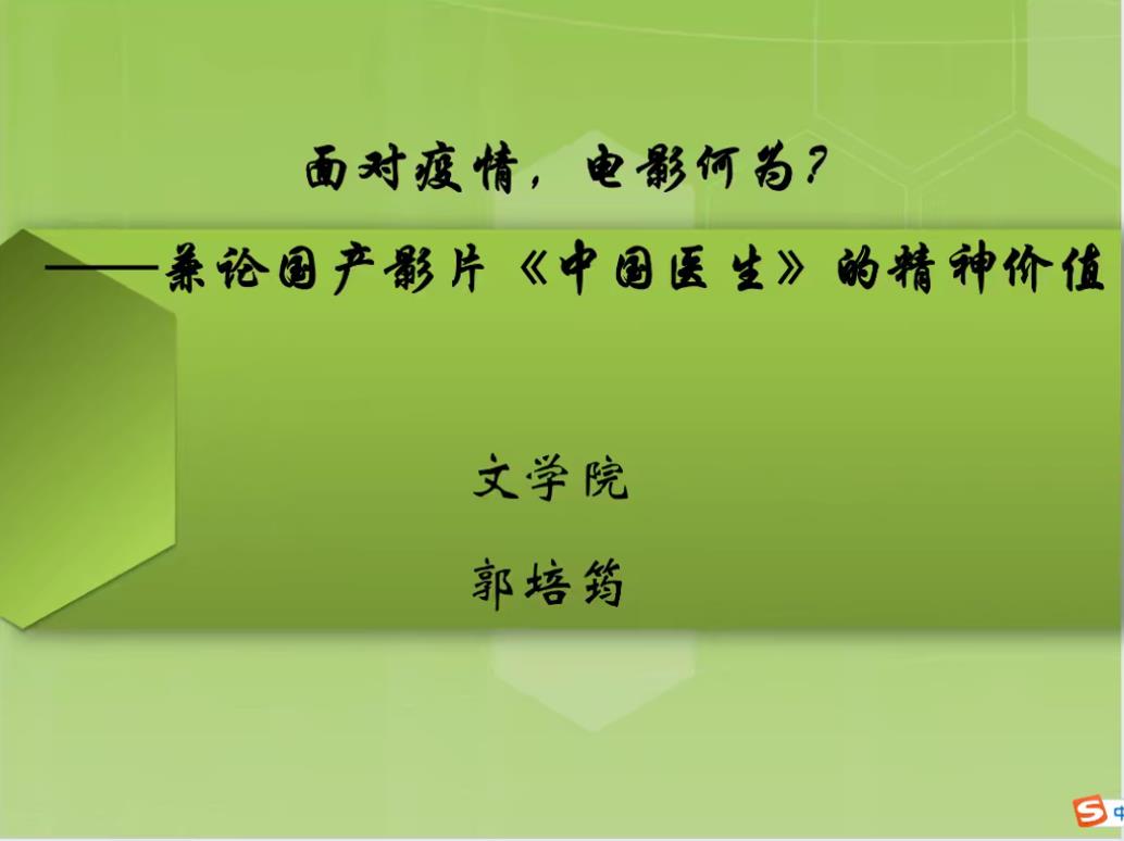 郭教授指出,“疫情电影”在某种程度上可以成为深受疫情之困的人们心理疏导、缓释焦虑情绪的通道,是纪念抗疫事迹、宣扬抗疫精神的重要传播媒介。讲座重点围绕国产影片《中国医生》展开,郭教授归纳了该片四个方面的精神价值:“真实性美学”原则的高度体现;具有全民记忆的时代英雄群像;战胜困难的社会共同体意志和强大的国家力量;命运与共的大国情怀。讲座充分突显了人在面对灾难时的信念操守、责任担当,引导人们直面当下,思考未来。