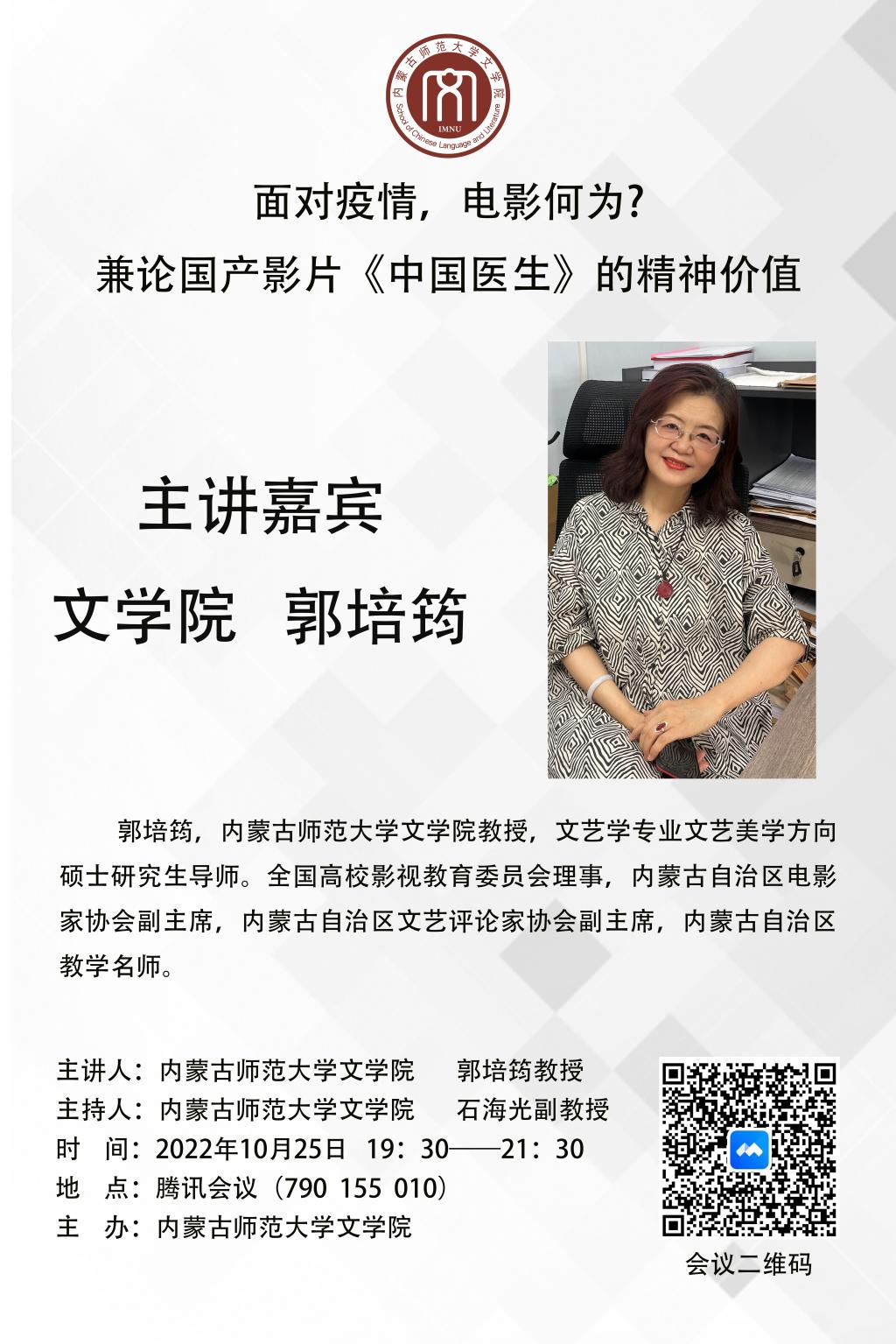 2022年10月25日,yl7703永利集团结合当前抗疫形势,组织了抗疫专题特别教研活动,由郭培筠教授做了题为《面对疫情,电影何为?——兼论国产影片<中国医生>的精神价值》的专场讲座。