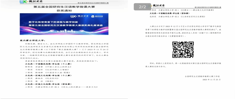 全国研究生汉语教学微课大赛是国内影响范围较广、体现研究生培养水平的国际中文教育专业类赛事,由北京师范大学国际中文教育学院、西北师范大学国际文化交流学院以及北京唐风汉语科技有限公司共同发起,大赛共有132所知名高校的4000多位学生报名参加,提交作品1900余件。经过初赛与决赛的激烈角逐,在业内专家和学者的共同评审下,于2023年11月25日公布了第五届全国研究生汉语教学微课大赛获奖名单。我院学生表现优异,获得个人赛特等奖、一等奖、二等奖各一项,三等奖两项;团体赛三等奖两项,优秀奖一项。