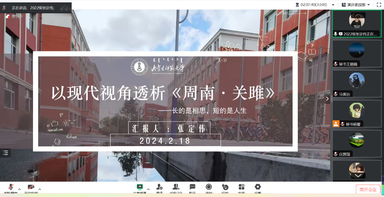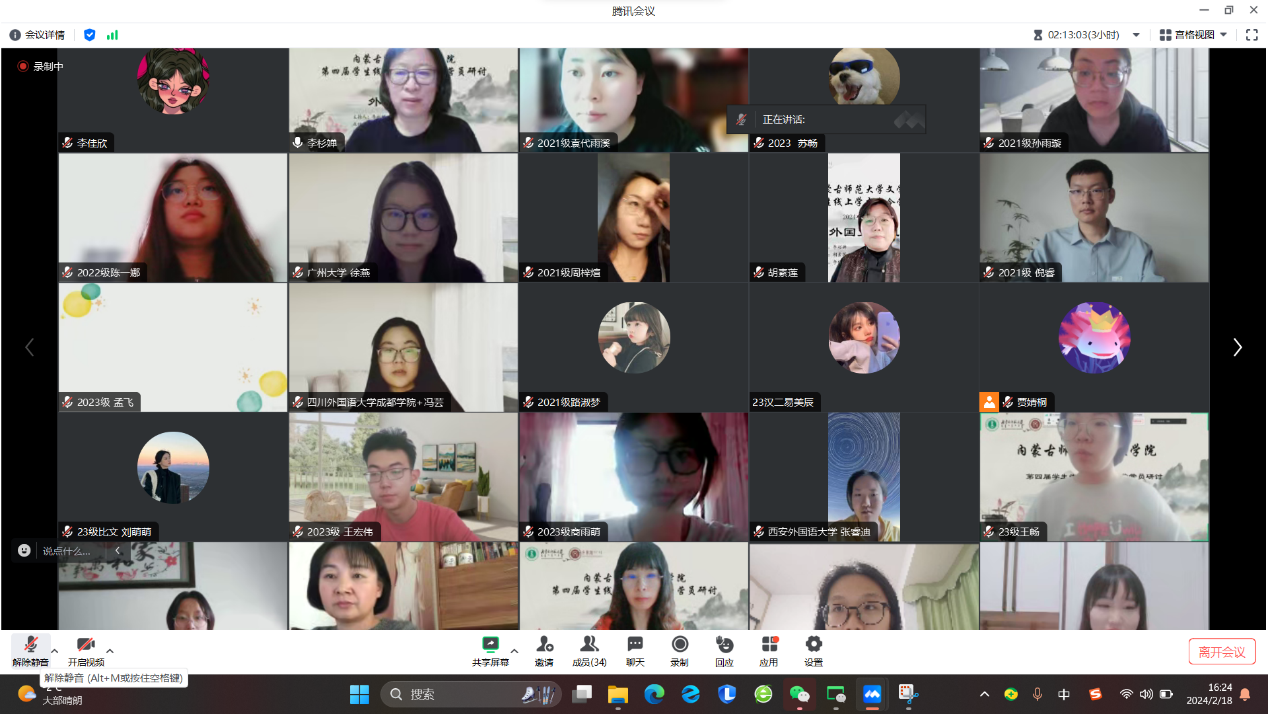 2024年2月18日为期两天的yl7703永利集团线上学术冬令营活动圆满落下帷幕。本次冬令营面向全国高校在读中文专业学生招生,经过严格选拔,共招收学员100人。其中,除本院各年级各专业学生之外,还有来自东北师范大学、中央民族大学、西安外国语大学、广州大学等高校的学生参加。活动形式主要包括知名专家学术讲座、校友报告、学术论文(读书报告)汇报与点评、营员研讨等内容。