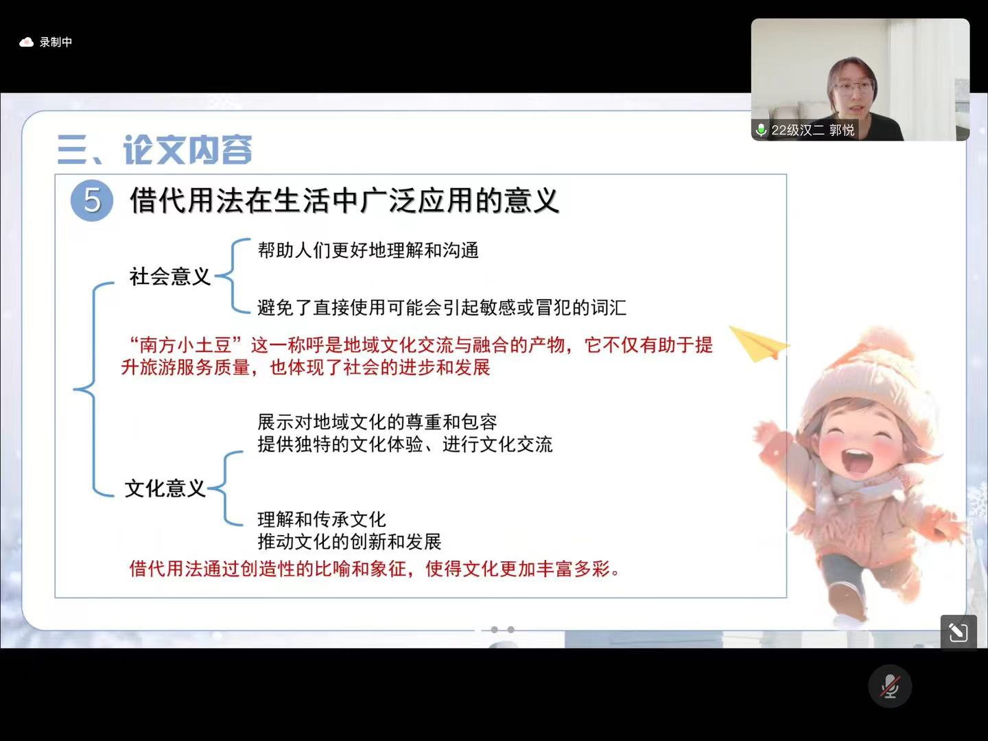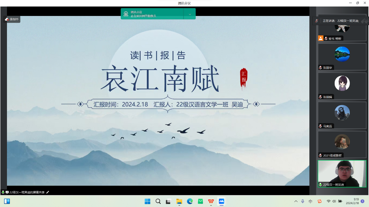 2月18日的活动主要为学术论文(读书报告)的汇报与点评及营员研讨。活动按学科分为四组,分别是中国古代文学组、中国现当代文学组、外国文学组和语言学、文字学组,共57名学生做了线上汇报。我院教师李杉婵、孙静、马奥远、刘婕分别担任各学科组长,组织了各组的论文(读书报告)汇报评议与营员研讨活动。
