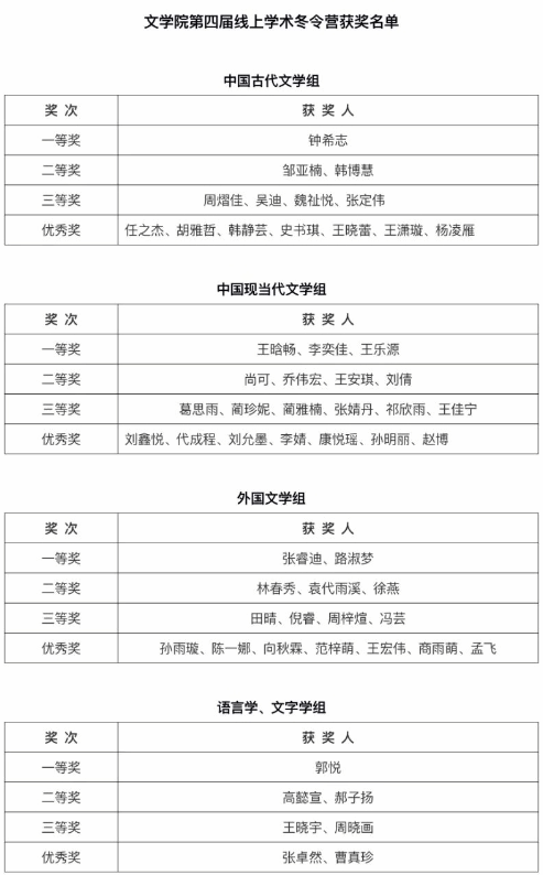 本届冬令营丰富了学生的假期生活,加强了师生间的交流与互动,开拓了学生视野,激发了学生的学习兴趣,增长了学生知识,陶冶了学生情操,砥砺了品格,提升了学生的学习研究能力。特别是高标准的论文(读书报告)要求和教师点评,为学生的毕业论文撰写打下了坚实基础。