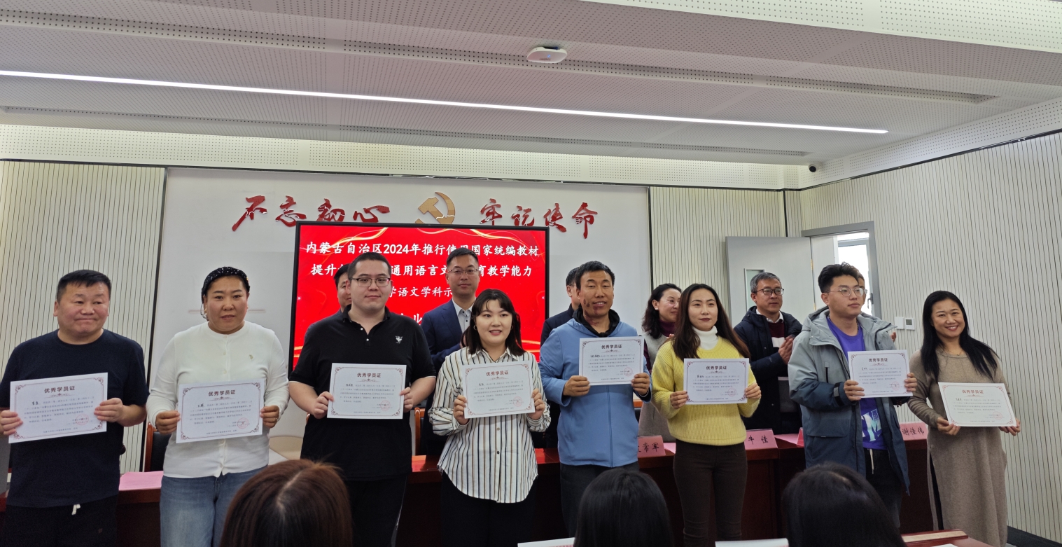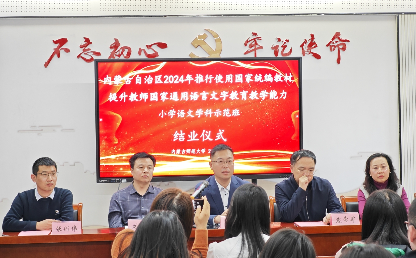 2024年12月20日,我院和继续教育学院共同承担的内蒙古自治区2024年推行使用国家统编教材提升教师国家通用语言文字教育教学能力小学语文学科示范班培训工作圆满完成,参训的48位学员全部顺利结业,当日举办了隆重的示范班结业仪式。我院副院长张钧、汉语言文学系主任李瑞春、青年教师谢佳伟出席示范班结业仪式。