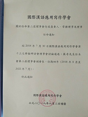 7月31日至8月2日,由国际汉语应用写作学会、澳门大学人yl7703永利集团中国语言文学系、澳门写作学会共同主办的“国际汉语应用文研究高端论坛” 在澳门大学召开。来自大陆、香港、台湾、澳门、新加坡、韩国等六十三位学者参加了本次高端论坛。我院教师万奇教授应邀参加了本次会议。万奇教授做了题为《居今探古:王志彬对〈文心雕龙〉研究与应用》大会发言,并分别与香港大学容运姗博士、香港大学岑绍基教授主持第一小组第二单元、第四单元的学术发言。万奇教授获聘本次高端论坛优秀论文评审委员会委员,又经国际汉语应用写作学会第十三次学术研讨会理事会讨论通过,任国际汉语应用写作学会第二届理事会副会长。