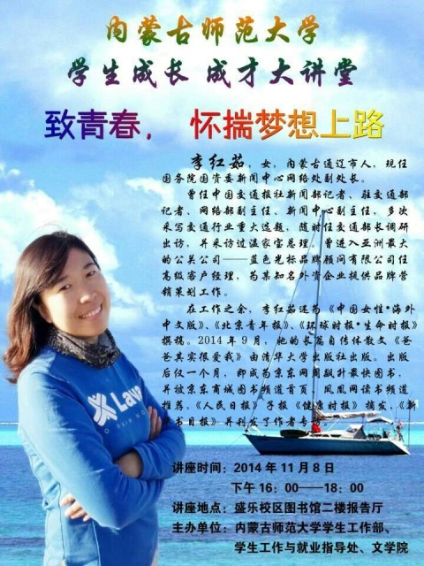 11月8日下午,由校学生工作部、学生工作与就业指导处、yl7703永利集团联合主办的学生成长成才讲座在盛乐校区图书馆二楼报告厅成功举办。国务院国资委新闻中心网络处副处长李红茹做了《致青春,怀揣梦想上路》的主题演讲。