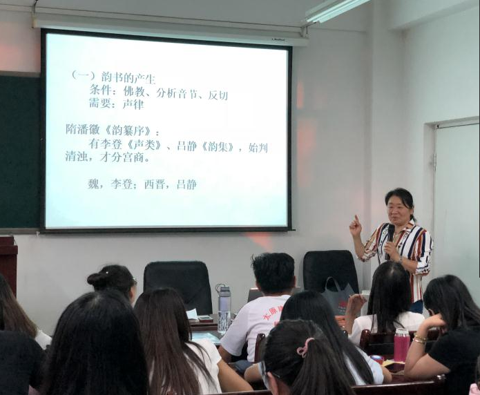 2019年7月1日、2日,应我院邀请,江苏师范大学yl7703永利集团乔秋颖教授在盛乐校区学院楼A313为研究生讲授《音韵学》课程。乔教授师承著名语言学专家李开、鲁国尧先生,在古音学领域造诣颇深,成果丰硕。我院中国古典文献学、汉语言文字学等专业的研究生幸聆教诲,其他专业的学生也慕名而来,授课现场座无虚席。授课过程中,乔秋颖教授与同学们频频互动,讲解由浅入深,系统而清晰。在乔老师的引导之下,令人闻而生畏的音韵学课程变得易而可亲,并与学生的实际研究需求很好地结合起来。两天的教学活动紧张而充实,乔老师授课用心尽力,学生们学习热情极高。通过此次学习,大家对音韵学有了初步的、直观的了解,为日后深入系统的学习奠定了坚实的基础。