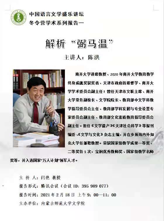 2021年2月18日上午,我院第一届线上学术冬令营活动正式开营。南开大学陈洪教授为我院师生作了题为《“解析‘弼马温’——从‘弼马温’说道《西游记》与全真教之缘》的精彩学术讲座。本场讲座由闫艳院长主持,采取线上方式进行,我院260余名师生共同聆听了本次讲座。