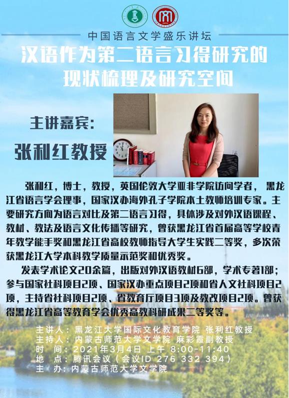 2021年3月4日上午,黑龙江省语言学会理事、国家汉办海外孔子学院本土教师培训专家、黑龙江大学国际文化教育学院张利红教授,采用腾讯会议的形式为我院师生作了题为“汉语作为第二语言习得研究的现状梳理及研究空间”的学术讲座。本场讲座由我院语言学与应用语言学硕士点点长麻彩霞博士主持,我院相关专业的师生聆听了讲座。
