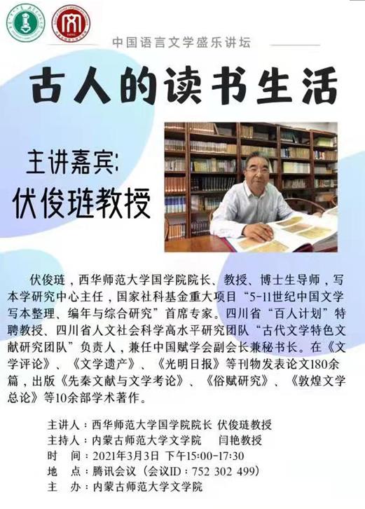 2021年3月3日下午,华西师范大学伏俊琏教授为我院师生作了题为“古人的读书生活”的精彩学术讲座。本场讲座由闫艳院长主持,采取线上方式进行,我院相关文学专业50余名师生聆听了本次讲座。