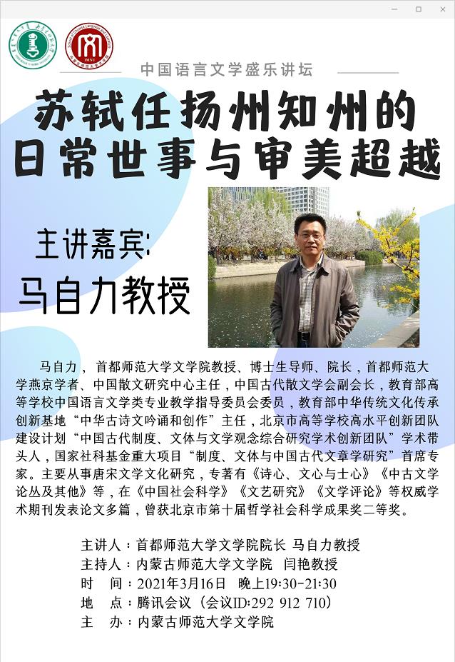 2021年3月16日晚上,马自力教授为我院师生作了题为《苏轼任扬州知州的日常世事与审美超越》的精彩学术讲座。本场学术讲座采取线上方式进行,由闫艳院长主持,我院100余名师生共同聆听了本场讲座。