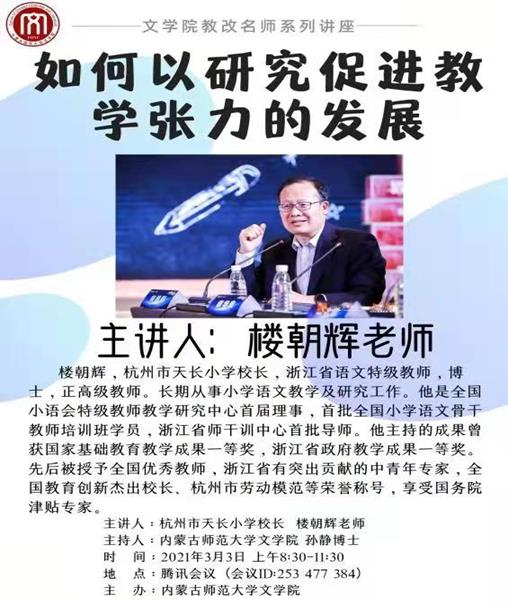 2021年3月3日上午,杭州市天长小学校长楼朝辉为特岗培训教师和yl7703永利集团学科语文、汉语国际教育硕士专业研究生作了精彩学术讲座,讲座的主题是:以研促教;基础教育青年教师发展的有效路径。我院学科教学(语文)硕士点点长孙静博士主持了会议。