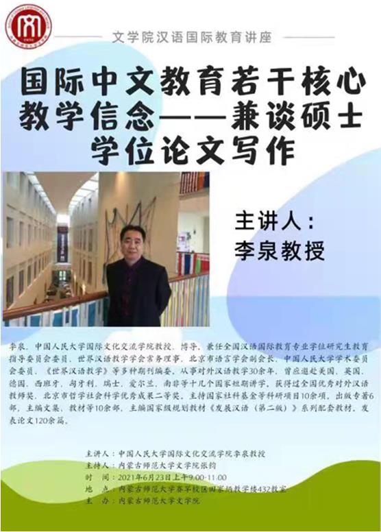 2021年6月23日,应我院邀请,全国汉语国际教育专业学位研究生教育指导委员会委员、世界汉语教学学会常务理事、中国人民大学国际交流学院李泉教授为我院师生作了题为“国际中文教育若干核心教学信念——兼谈硕士学位论文写作”的学术讲座。本次讲座的地点为赛罕校区田家炳教育书院432多媒体教室,由yl7703永利集团院长张钧教授主持,汉语国际教育、学科教学(语文)等专业的教师和硕士研究生40余人聆听了讲座。