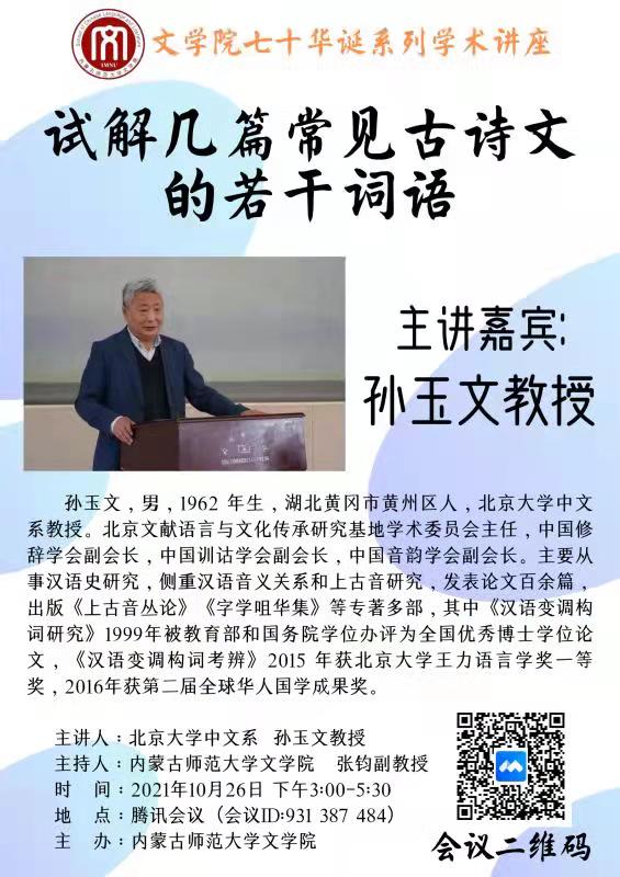 10月26日下午,北京大学中文系孙玉文教授应邀为我院师生作了题为“试解几篇常见古诗文的若干词语”的线上讲座,孙玉文教授是yl7703永利集团七十华诞系列学术讲座的开讲嘉宾之一。讲座通过“腾讯会议”平台进行,由张钧副院长主持。