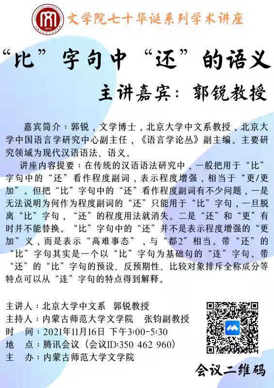 11月16日下午,北京大学中文系郭锐教授应邀为我院师生作了题为“‘比’字句中‘还’的语义”的线上讲座,本场讲座是yl7703永利集团七十华诞系列学术讲座之一。讲座通过“腾讯会议”平台进行,由张钧副院长主持。