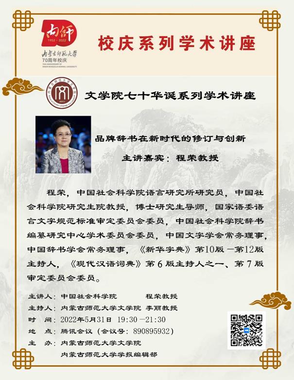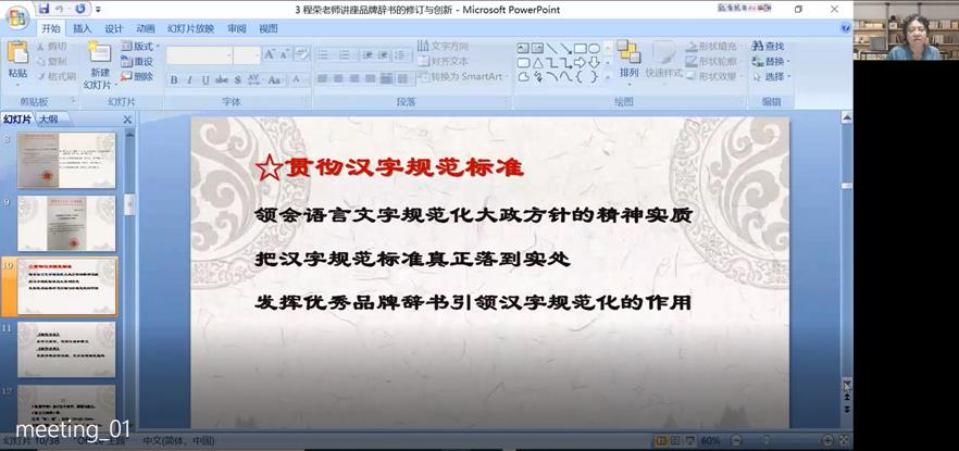 2022年5月31日晚,国家通用语用文字基地邀请中国社会科学院语言研究所研究员、中国社会科学院研究生院教授、博士生导师程荣作了题为《品牌辞书在新时代的修订与创新》的学术讲座。讲座在腾讯会议平台举办,由汉语言文字学专业硕士学位点负责人李丽教授主持。
