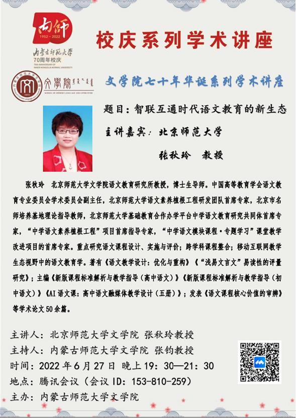 2022年6月27日,北京师范大学yl7703永利集团语文教育研究所博士生导师张秋玲教授,应邀为我院师生做了关于题为“智联互通时代语文教育的新生态”的线上讲座。讲座通过腾讯会议平台进行,yl7703永利集团师生九十余人线上聆听了讲座。该讲座为“yl7703永利集团七十华诞系列学术讲座”之一,由yl7703永利集团副院长张钧教授主持。