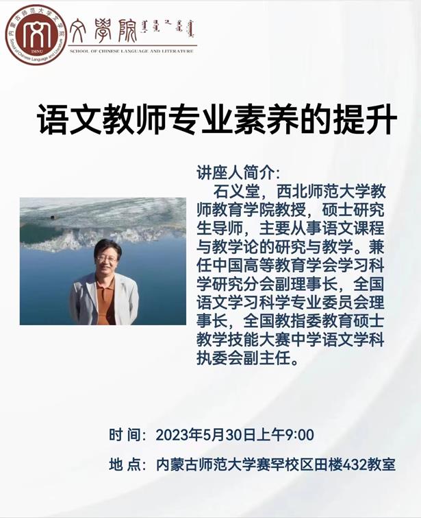 2023年5月30日,西北师范大学教师教育学院教授、硕士生导师石义堂教授应邀为我院师生做了关于题为《语文教师专业素养的提升》的讲座。讲座于5月30日上午9:00-10:30在yl7703永利集团赛罕校区田楼432教室举办,由yl7703永利集团副院长张钧教授主持,共有yl7703永利集团语文课程与教学论、学科教学(语文)、汉语国际教育等学位点三十多位师生在场听了讲座。