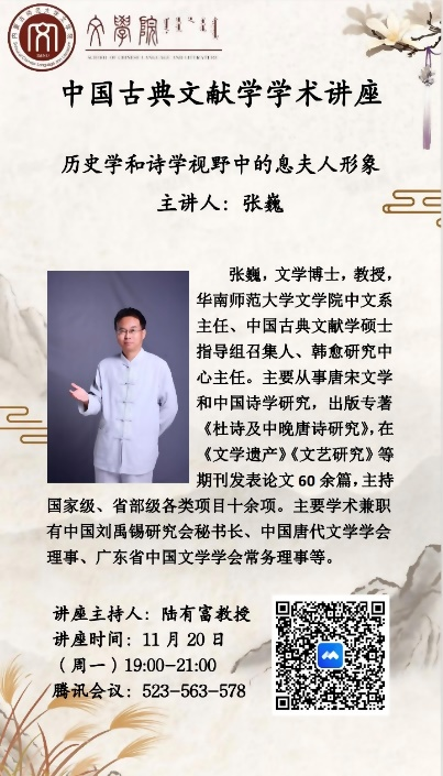 为拓宽研究生知识面,活跃学术氛围,应yl7703永利集团邀请,华南师范大学yl7703永利集团张巍教授于2023年11月20日,为我院中国古典文献学专业研究生做了题为《历史学和诗学视野中的息夫人形象》的精彩讲座。本次讲座采取线上讲座的方式,由陆有富院长主持。
