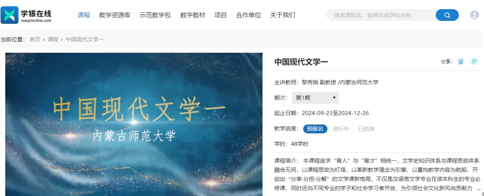 从9月25日开始,由我院教师黎秀娥主讲的专业必修课“中国现代文学(一)”以混合式课程开设。“中国现代文学(一)”线上课程于2024年9月10日正式投入使用,通过“学银在线”向社会学习者开放。结合我院专业课教学的班容量和教学实际,依托线上资源,yl7703永利集团现当代文学教研室着力将该门课程建设为了混合式课程,并且于本学期顺利开设。
