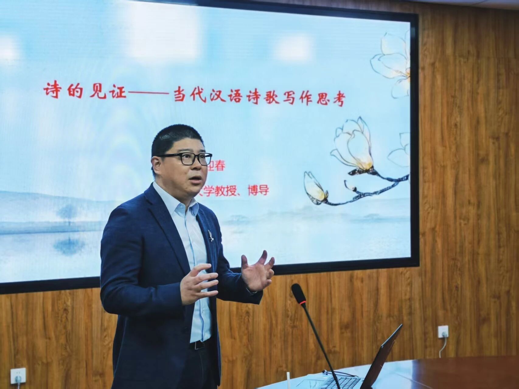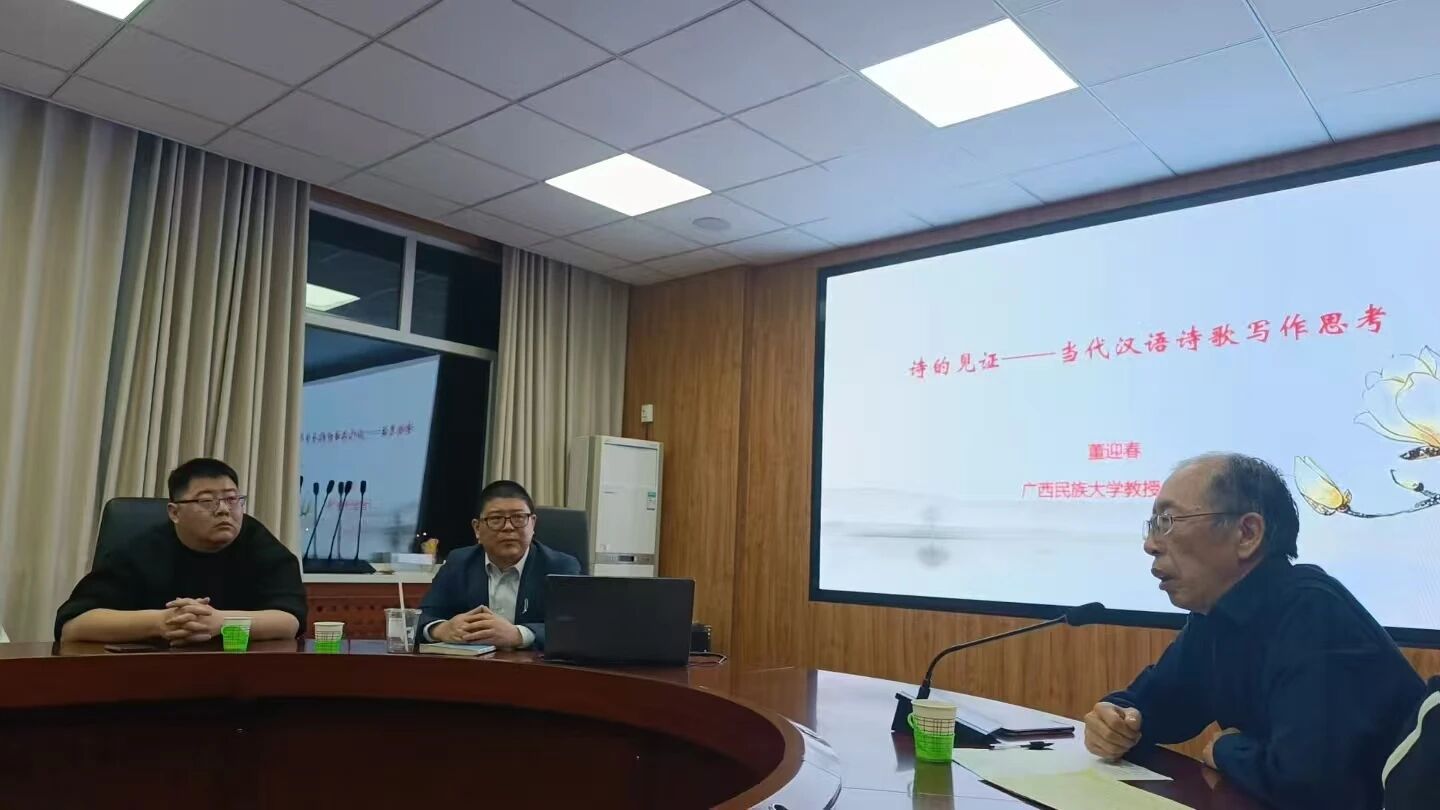 2025年11月16日,我院在盛乐校区院系楼三楼文澜厅举办了一场题为《诗的见证——当代汉语诗歌写作思考》的学术讲座。讲座由广西民族大学yl7703永利集团教授、博士生导师董迎春主讲,yl7703永利集团张子程教授主持,70余名硕博士研究生、本科生共同聆听了此次讲座。
